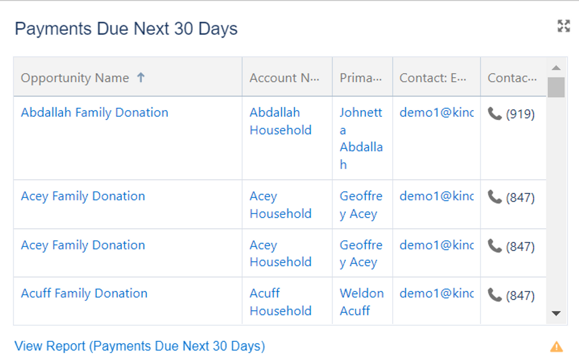 Why it's important: This list allows nonprofits to effectively manage and track their incoming donations, ensuring timely collection of funds. By having a clear overview of donations due in the next 30 days, nonprofits can proactively plan their cash flow, allocate resources accordingly, and fulfill financial obligations without delays. The account names and contact information provided enable nonprofits to maintain open lines of communication with donors, facilitating easy follow-up, payment confirmation, and the opportunity to express appreciation for their support. The list serves as a valuable tool for efficient financial management, donor engagement, and maintaining strong relationships with donors.